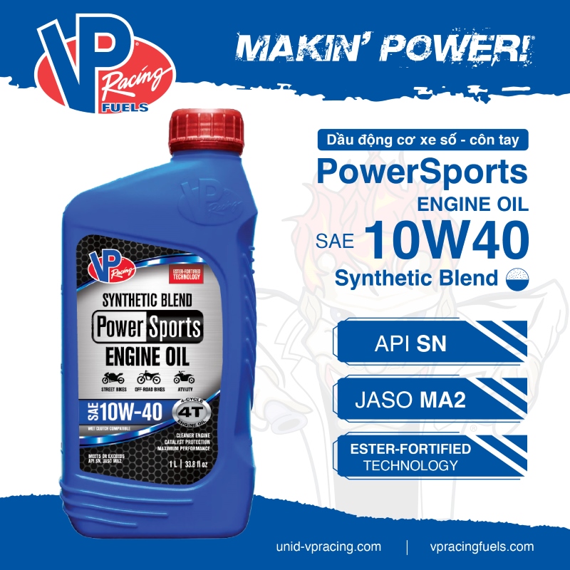 VP POWERSPORTS 4T SYNTHETIC BLEND ESTER TECH 10W-40 là dầu động cơ hiệu suất cao được pha chế từ dầu gốc khoáng tinh chế sâu và dầu gốc tổng hợp chất lượng cao, kết hợp với công nghệ Fortified Ester và hệ phụ gia thế hệ mới đã được kiểm chứng trong các cuộc đua. Sản phẩm sử dụng cho động cơ xe máy 4 thì hiện đại, xe tay ga, xe địa hình ATV hay UTV được trang bị hệ thống ly hợp ướt và yêu cầu chất bôi trơn chuẩn MA2. Công thức sản phẩm được phát triển dựa trên kinh nghiệm nhiều thập kỷ của VP Racing trong lĩnh vực nhiên liệu và chất bôi trơn hiệu suất cao trên các đường đua.
